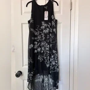 New with tags, never worn. Perfect for the upcoming Spring and Summer graduations, weddings, showers and any other occasion you can think of! Cascading from opaque to sheer with a sketched floral print this dress is both demure and alluring all at once. Add a jacket and it will be ready for fall too!