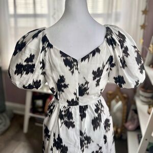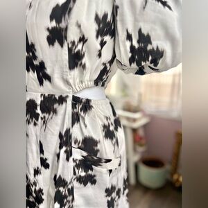This sundress has a black and white abstract ink blot design that is similar to an animal print, with playful puff sleeves and cut outs at the nipped in waist. I wore this once for a summer wedding and was comfortable all night - EUC