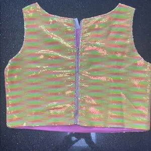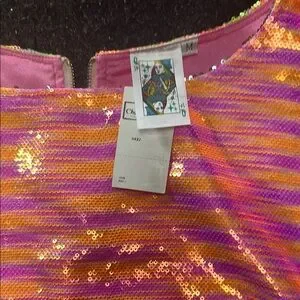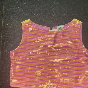 Vibrant pink and orange sequin crop top. Perfect for parties and events. Back is yellow and orange sequined. Zipper closure. Brand new with tags