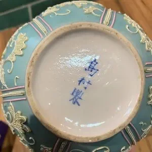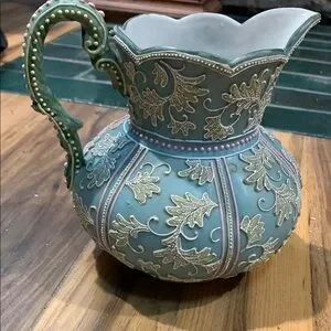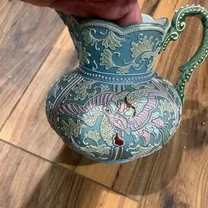 Vintage mint green and pink 5” vase or small pitcher w raised painted detailing