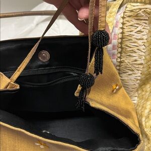 There are handmade beaded tassels on the ends of the decorative ties - this is a most decorative - lightweight - silk & feminine summer bag💞