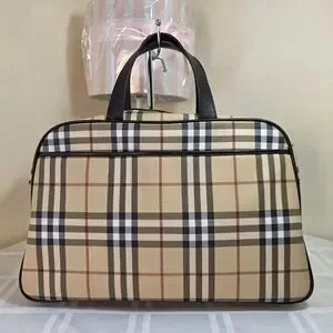 Stylish and spacious, this Burberry overnight bag features a classic beige checkered design. Perfect for travel or daily use, it combines elegance with functionality.
