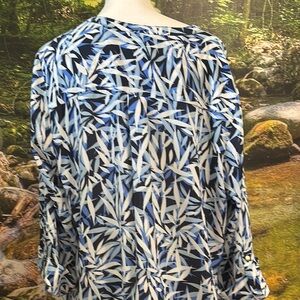 Stylish women's top featuring a vibrant blue and white pattern. Perfect for casual outings or a day at the office.