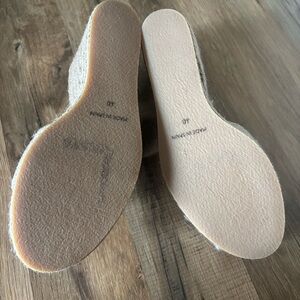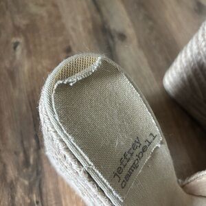 Step out in style with these Jeffrey Campbell tan wedge sandals. Perfect for any occasion, these shoes offer both comfort and elegance. Size 9.5. Never worn, however the heel is pulling up a bit as shown.