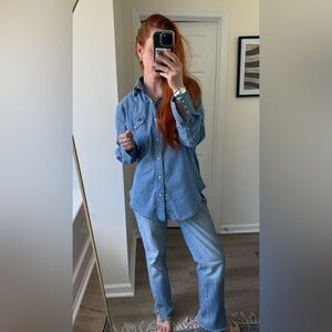 Stylish denim button-up shirt. Perfect for casual wear. Classic design with front pockets.