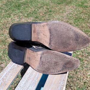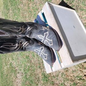These leather heeled boots from Justin Boots feature a striking dark grey & white color scheme decorative cross design, perfect for making a statement. Crafted with a glossy leather finish, they showcase intricate decorative stitching that adds a touch of elegance. Ideal for both casual & formal occasions, these boots offer a blend of style and comfort. Great for western dancing with your favorite jeans or dress, skirt. Ready for NFR Rodeo. Worn but have a lot of use left.