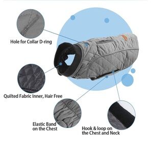 Insulated Quilted Winter Dog Coat with reflective details. Can be used with harness or leash and collar. Easy Velcro strips secure coat around your dog. Excellent condition