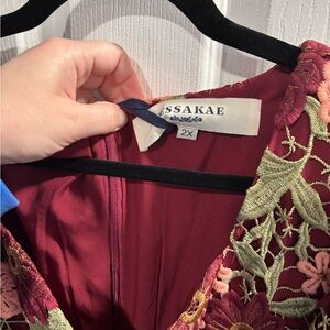 NWT- This elegant dress with vibrant lace by JessaKae features a beautiful lace floral pattern in green and red, perfect for any special occasion. The neckline and flutter short sleeves add a touch of sophistication, while the midi length offers a graceful silhouette. It’s gorgeous and is limited edition.
