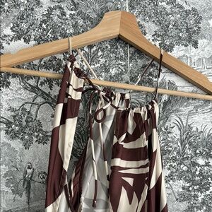 Stylish slip dress with a geometric pattern. Features Distorted Harlequin pattern in brown and cream colors. Originally purchased from Lisa Says Gah! Worn once.