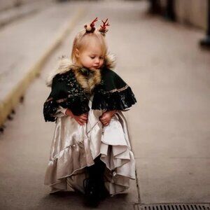 Dress your little one in style with this charming Handmade Green Embroidered Cape with Fur Trim, accompanied by a matching romper, perfect for baby girls in size 9-12 months! The elegant cape can be worn on a larger toddler as they grow, making it ideal for special occasions and photo shoots. Please note that the cover picture features only the cape and not the silver dress.