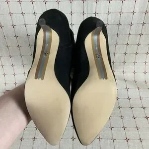 Almond Toe, Low heel is about 2.5”. Tie closure at the top. Short Side Zip