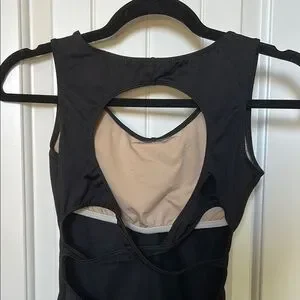 Elegant black sleeveless leotard with a cross in the back. Perfect for dance lessons and classes.