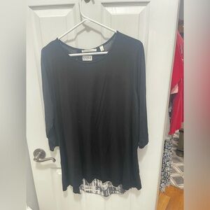 This elegant black blouse by Cyrus showcases 3/4 length sleeves and a relaxed fit, crafted from a soft, flowing fabric for a versatile and comfortable wear.