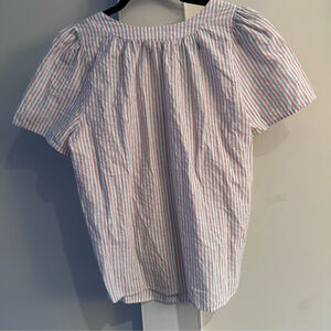 Beautiful and romantic Sonnet smocked top by Isabella Sinclair, striped red, white and blue. Machine wash cold. 90% Cotton. Very slight wash wear, no flaws. Length from shoulder to hem 23.5" app. Sleeve length 9" app.