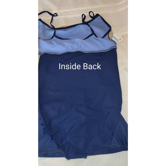 Previously Owned Vintage Jantzen Swim dress. A combination of light blue and navy blue with some white trimming. Lined. All one piece.