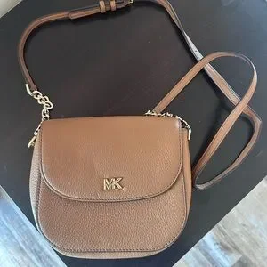 Timeless and elegant, this Michael Kors crossbody bag is crafted from rich tan pebbled leather with gold-tone hardware for a polished finish. The structured silhouette and compact size make it perfect for on-the-go style. Features the signature MK logo on the front flap, an adjustable leather strap with chain detail, and a secure zip-top closure.