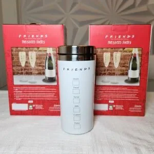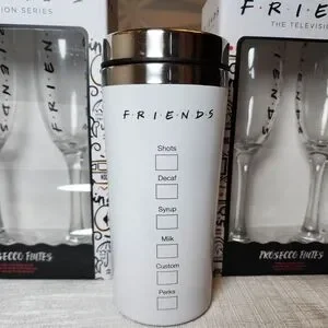 Enjoy your favorite beverages on the go with these brand new wine glasses set and coffee tumbler mug in perfect condition. Super cute gift items for any FRIENDS Central Perk fan. This stylish white mug is perfect for fans of the iconic TV series, feel like you're on the set of Monica's apartment with these prosecco flutes.