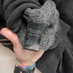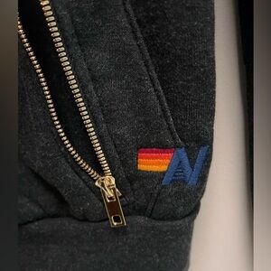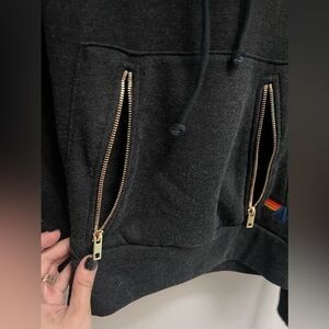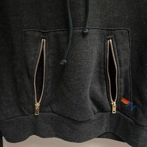 AVIATOR NATION Women’s Dark Grey Hoodie with Smily Face - Size X-Small. Long sleeve, dark Grey hooded Sweatshirt with a kangaroo pocket on the front. The kangaroo pocket features two functioning gold zippers to keep your items in place. The yellow and black smily face patch has lighting bolt eyes in red. The aviator nation logo is featured in the lower right corner. The hood has drawstring pull ties. 50% Cotton/ 37% Polyester/ 13% Rayon. Great condition overall, natural pilling due to the softness of the material but very hard to see with the naked eye.
