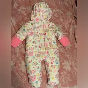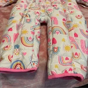 Keep your little one cozy in this vibrant snowsuit. Featuring a playful rainbow and sun pattern, it's perfect for chilly days. The pink lining adds a touch of warmth and style.