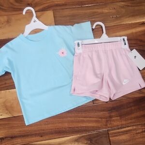 Charming Nike set with a light blue tee featuring a floral accent. Paired with soft pink shorts. Ideal for casual outings.
