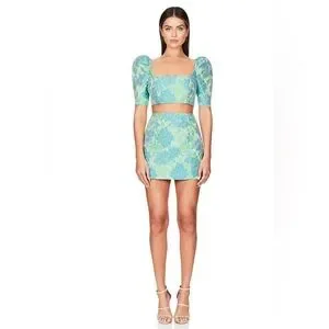 Super cute puff sleeve crop top. Made in floral, woven jacquard, fully lined. Exposed rose gold zipper at centre back.