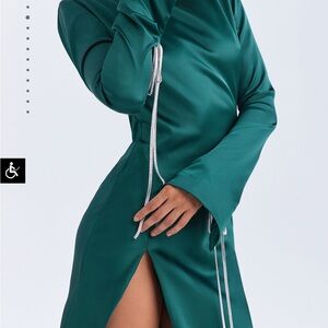Effortlessly beautiful, we love the simple yet sexy silhouette of this beautiful teal dress. Cut from fluid satin that flows effortlessly through the body, it features a high straight neckline and has a relaxed fit. The sleeves fall to split crystal bow cuffs for an ultra glamorous vibe and the daring thigh high split is super sexy.