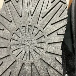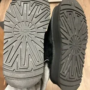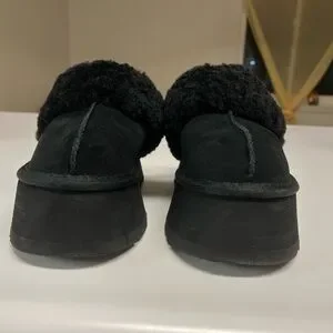 Experience the ultimate in comfort with UGG's black slippers, featuring a plush furry strap and a stylish platform sole. These slip-on slippers are designed with a cushioned footbed, ensuring a cozy fit for everyday wear.