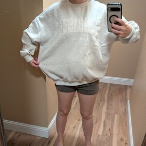 This gray crew neck sweater features a subtle tonal design with embossed lettering on the chest, offering a stylish yet understated look. Crafted from a soft cotton-polyester blend, it ensures comfort with its relaxed fit and fleece-like interior. The ribbed collar, cuffs, and waistband add a classic touch to this everyday essential.