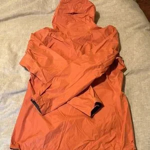 Super Lightweight Rain Jacket. Worn a couple times. Some small blemishes on lower right side. Really easy to pack & travel with & have as a protective layer for some light rain.