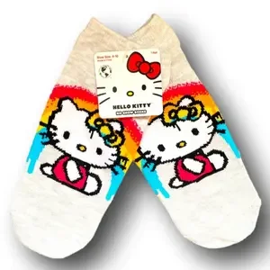 Funny Novelty No-Show Socks. Hello Kitty & Rainbow design. Gray, pink, white, orange, yellow, blue, & black colors. 50% recycled polyester, 48% polyester, 2% spandex. Brand new with tags attached. Great for gifts or stocking stuffers!