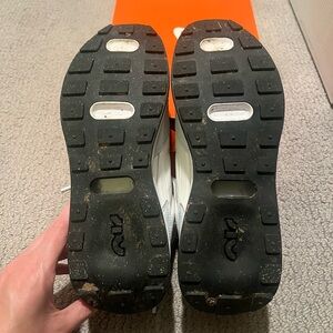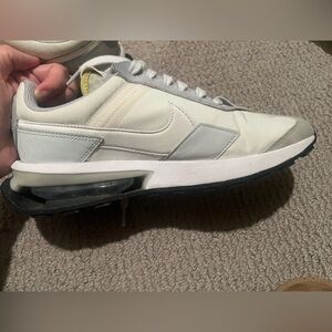 Stylish Nike Air Max Pre Day unisex sneakers shoes. Features a sleek white and gray design with gold accents. Unisex sneaker, Men’s size 6.5/fits women’s Size 8. Only worn a few times, good condition.