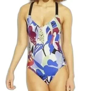 Vibrant one-piece swimsuit with a floral pattern. Features a mix of red, blue, purple, and black colors. Light padding in cups. Removable. No flaws. Size XS