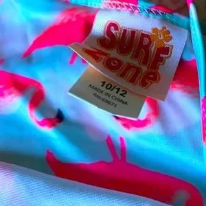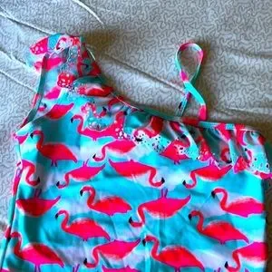 Surf Zone girls flamingo swimsuit in size 10/12. Features one shoulder style, ruffled eyelet trim in 85% polyester and 15% spandex. In excellent used, like new condition.