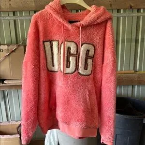 Cozy pink fuzzy hoodie with UGG logo. Perfect for casual wear. Excellent condition, worn once. Peachy/ pink in color
