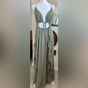 RusttyDustty Modern Bohemian Crush. Step out in style with this elegant olive green maxi dress. Perfect for any occasion, this dress offers a flattering fit and a chic design. Plunge V neck with tie front. Adjustable criss cross straps. Elastic waist. Ruffles down the sides and side slit. Size XL. NWT
