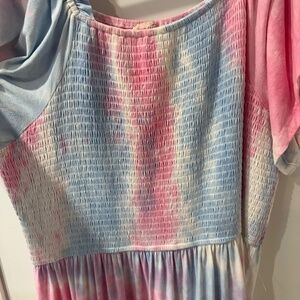 Step into spring with this whimsical and flowly cotton candy colored dress (size 1X) with a smocked bodice and a square neckline!