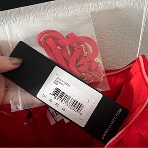 NWT. Thigh-high split. Off the shoulder neckline with optional removable straps.