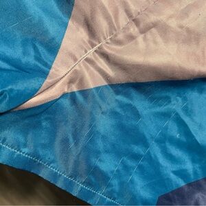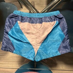 Vibrant shorts with a geometric design. Features shades of blue and gray. Perfect for a pool day.