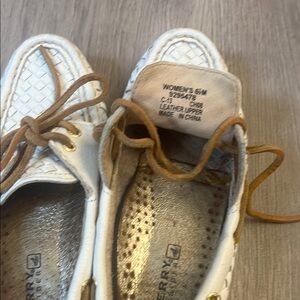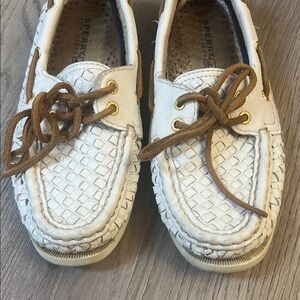 Stylish white woven boat shoes with brown laces. Perfect for casual outings.
