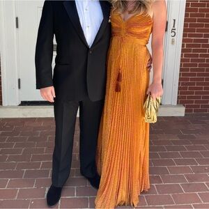 This stunning Alexis pleated plisse gown in Amber, a vibrant gold and peach fabric, is so fun to dance in!