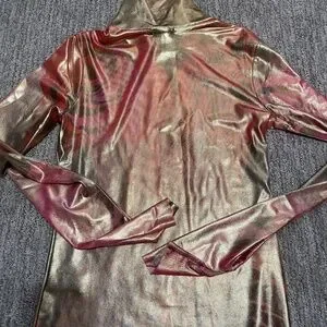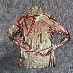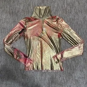 • Design: Semi-sheer metallic mesh with a high mockneck