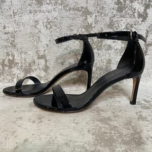 Gorgeous heels from Stuart Weitzman! Features stiletto heel, thin ankle strap, thin toe strap, round toe, all black color, patent leather exterior, and iconic style called "Nudist 75".