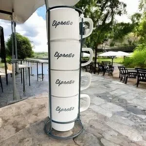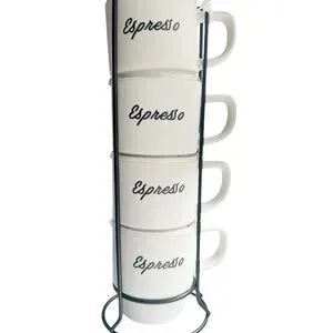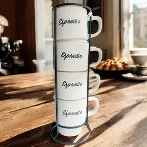 Set of stackable white espresso mugs with black lettering. Perfect for coffee lovers.