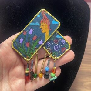 🍄Vintage Hand Painted Genuine Leather Artisan Brooch & Earring Set