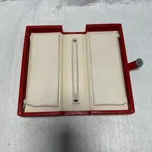 Pottery Barn jewelry box organizer set of 3. Large box with lock, mirror inside top cover, removable tray with multiple compartments. Purse size carry case, travel 2 sided case with removable pouches. Red faux croc finish, stone suede linings and backings etc.