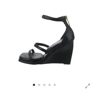 These elegant black wedges by Tamara Mellon feature a high wedge heel and multiple thin straps for a sleek, minimalist look. The ankle strap with buckle closure ensures a secure fit, while the monochromatic design adds a touch of sophistication to any outfit.