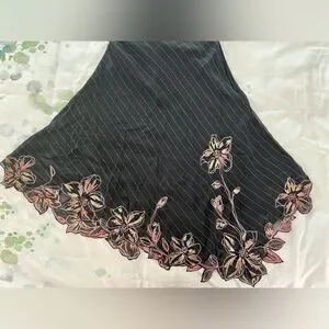 Such a beautiful asymmetrical dress. Silk with beautiful pink and orange embroidered flowers on the skirt. Cowl neck front, size zip. V-back.