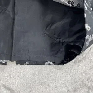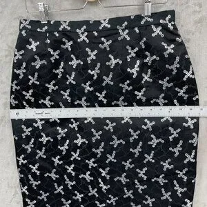 Escada sequin print brocade pencil skirt in black & metallic silver. Back zip closure with slit/ vent at hem. Skirt is fully lined. Material is a satin woven polyester/ silk blend. Size 42/ US L. Please see photos for measurements.
