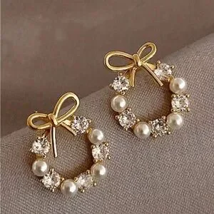 These elegant earrings feature a charming bow design with sparkling pearls and crystals, perfect for adding a touch of sophistication to any outfit.
