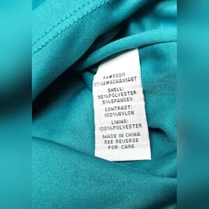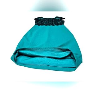 New with tags! Luxurious and super comfortable! Very soft & Stretchy with a Turquoise textured fabric. Beautiful black lace Overlay detail. Zip up back with eyehook closure. Fully lined with short cap sleeves. Midi bodyon style.